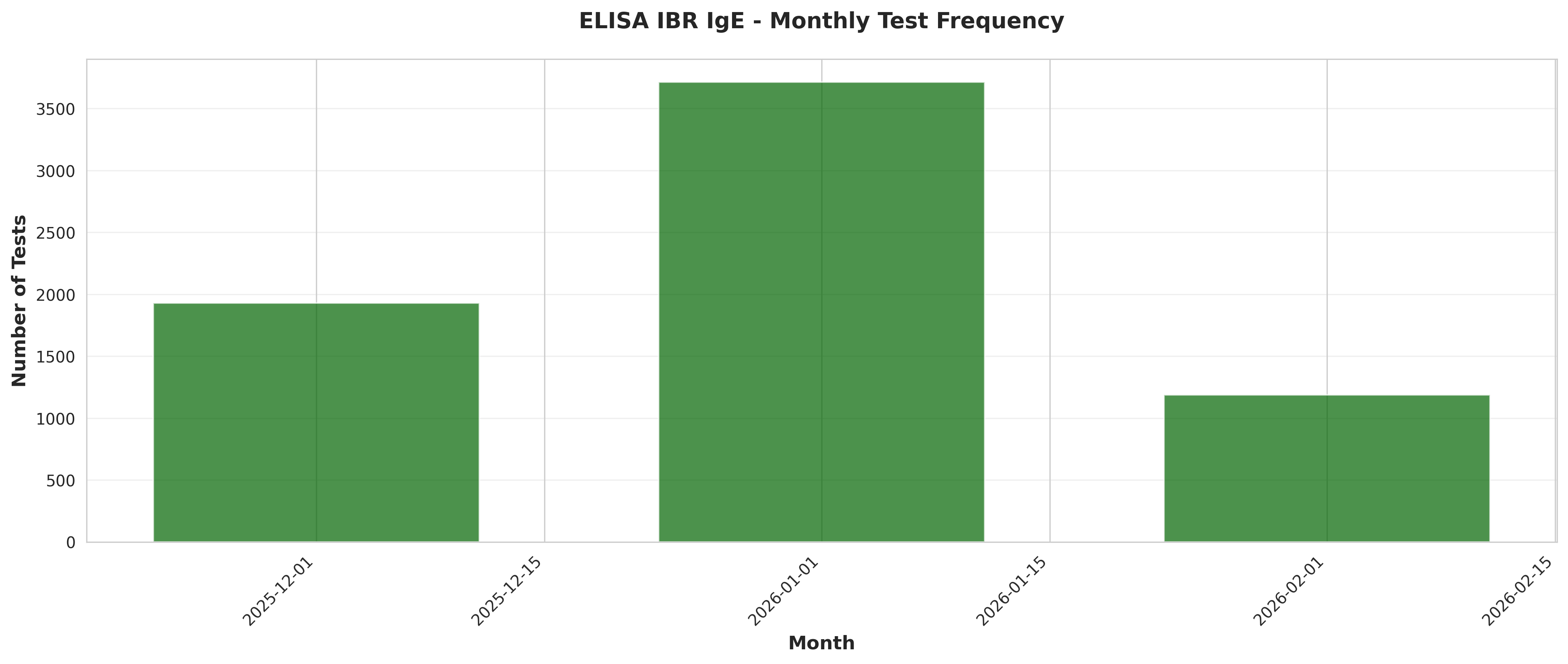 Pull out the ELISA IBR IgE assay and make an analysis over time of test frequency and obtained result values.
